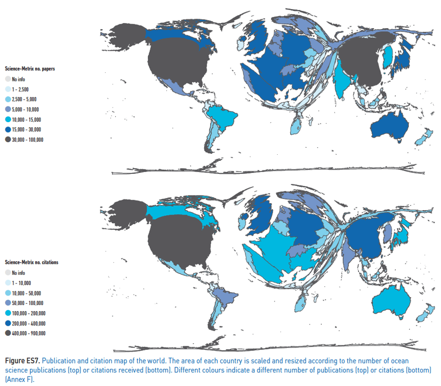 This graphic from IOC-UNESCO’s Ocean Science Report in 2017 really brings home how vital it is we share human and technical marine science capacities. At the top the map shows the countries of world distorted in proportion to the number of ocean science research papers produced by each country. On the bottom we see the corresponding number of citations.